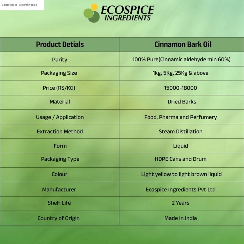 | Purity | 100% Pure (cinnamic Aldehyde Min 60%) |